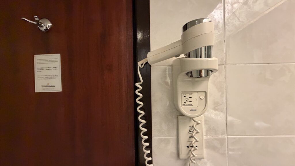ドライヤーは壁に備え付けで風量は普通程度でした。私は日本から海外対応のものを持参しています。